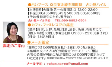 | 吉田結妃 武蔵野美術短期大学グラフィックデザイン専攻卒業。2003年ごろより精神世界研究家の松村潔氏にライフシンボルという絵画分析のアートセラピーを習う。氏の許可で、その考え方を生かした名刺デザインを 2009年から開始。またタロット、西洋占星術の占い師・米国CTI認定プロフェッショナルコーチでもあり東京を中心に対面セッションや講座も開催している。 |