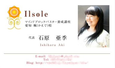 ![]() ![]() マインドブロックバスター養成講座愛知楓校代表の 「Ilsole」とは太陽の意味だそうです。 明るく元気なイメージをお写真の笑顔と共に ご注文ありがとうございました。 |