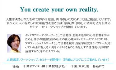 | 吉田結妃 武蔵野美術短期大学グラフィックデザイン専攻卒業。2003年ごろより精神世界研究家の松村潔氏にライフシンボルという絵画分析のアートセラピーを習う。氏の許可で、その考え方を生かした名刺デザインを 2009年から開始。またタロット、西洋占星術の占い師・米国CTI認定プロフェッショナルコーチでもあり東京を中心に対面セッションや講座も開催している。 |