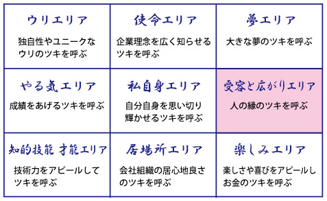 ←2-3 企業理念を広く知らせるツキを呼ぶ 真ん中上:使命エリア 左上:独自性エリア